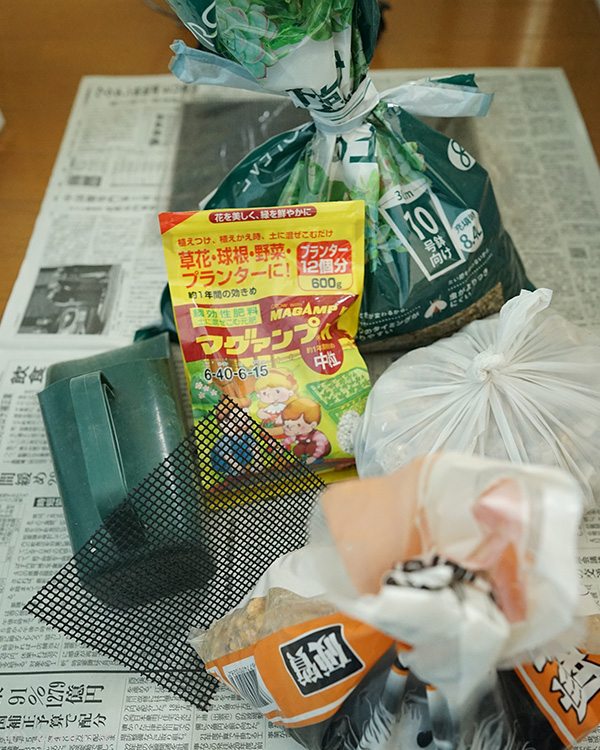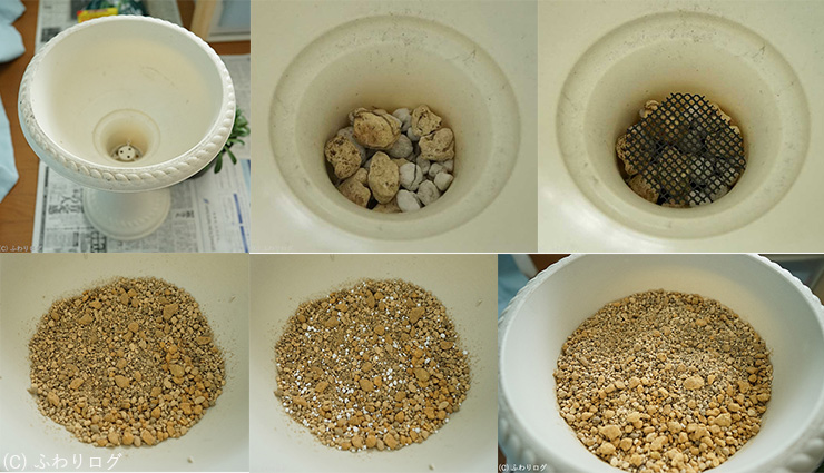 鉢底石を入れ鉢底アミを敷く ⇒ 土をかけてマグアンプをパラパラ ⇒ 土をかぶせる。