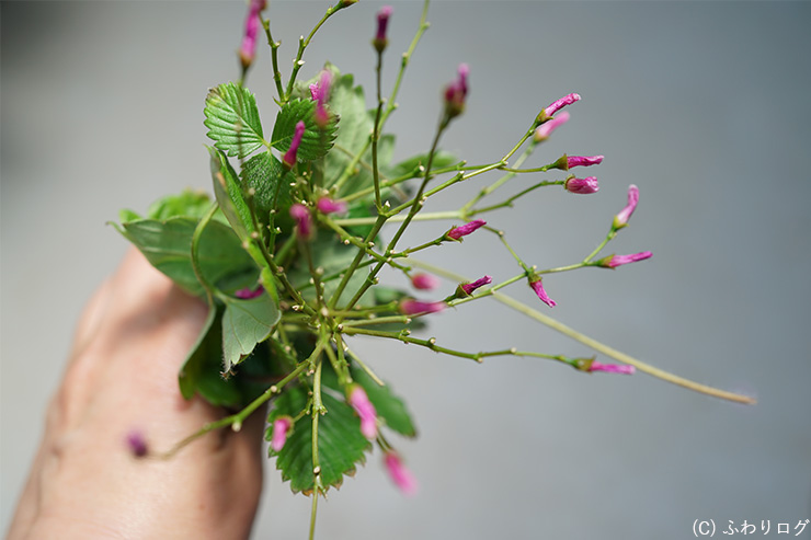 シンプルでスッとした美しい花殻をまびいたワイルドストロベリーの葉っぱでまとめたら、ブーケのようになりました☆
