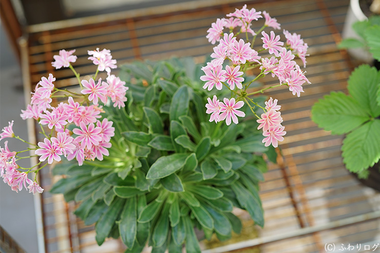 ベランダで咲くレウイシアとワイルドストロベリーの動画(23秒)。