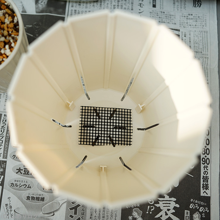 鉢底穴から土がこぼれないよう鉢底網を敷く