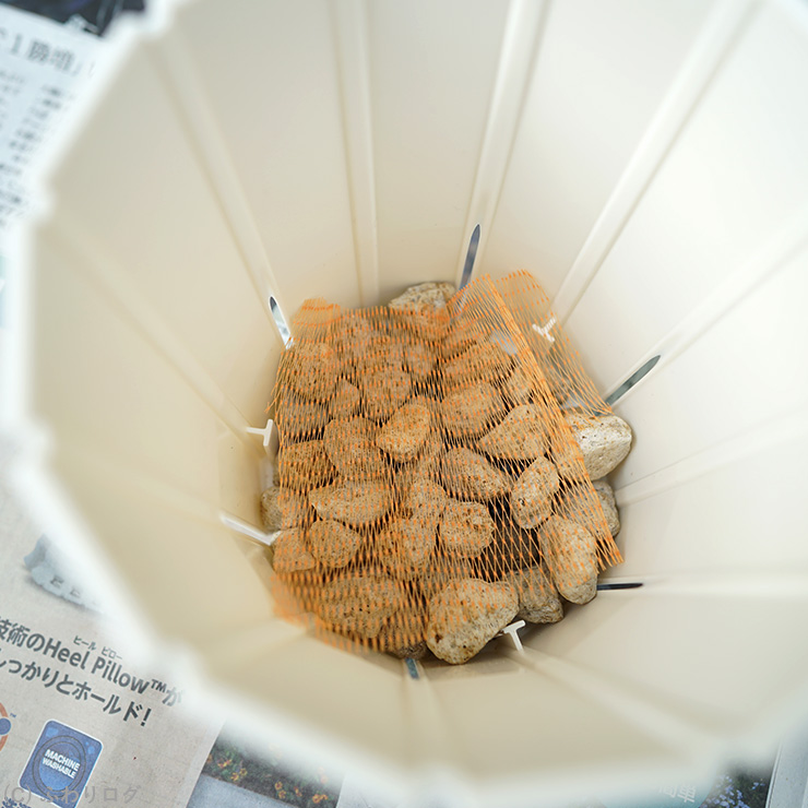 • (*1) 鉢底石:「ネット入り 鉢底に入れる石」が鉢よりも大きかったため、ネットを切って鉢底石を取り出し野菜ネットをかぶせました(笑)