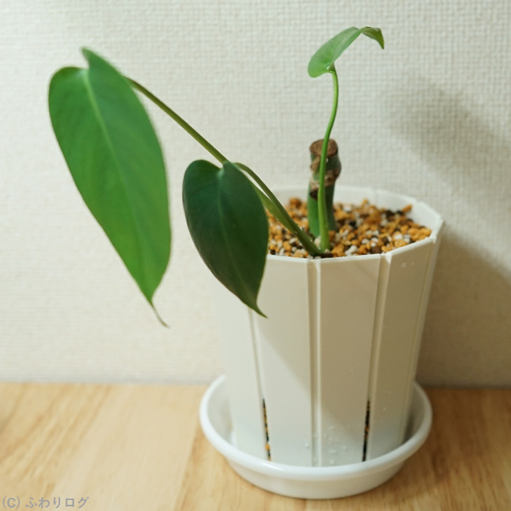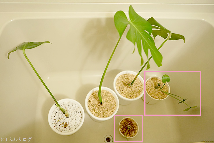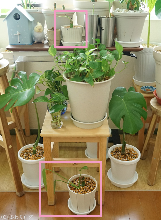1. 【モンステラ】2度目の水挿し(4) No.8を2鉢に植え替えた様子とわかったこと1つ [2025年7月]