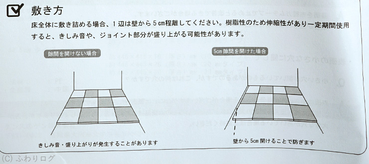 床全体に敷き詰める場合、1辺は壁から5cm程離します。