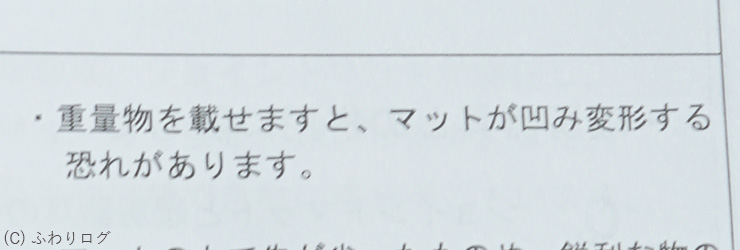 ⇒ “重量物を載せるとマットが凹み変形する恐れがあります“とのことなので、これは仕方ないですね(^^;