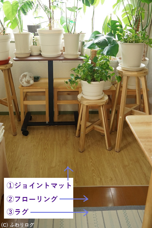 最初は観葉植物のスペースをカバーできる6枚だけ敷き、残りはデスクの下に敷きました。