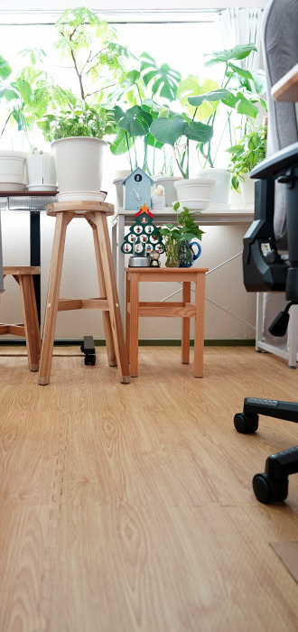 観葉植物に葉水をした後のフローリングの水染みや重たい家具によるフローリングの凹みを防げて、床の見た目が統一されたことで視界もスッキリしました(^^)/