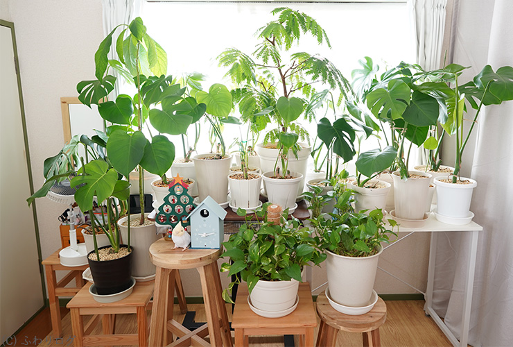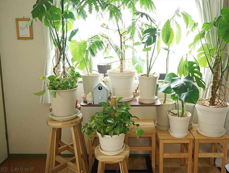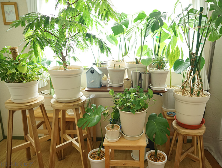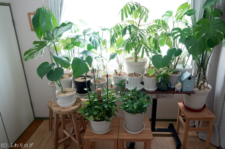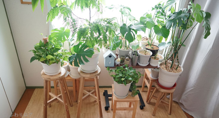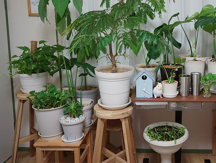 6月、外に置いていた一部の植物を室内に取り込み、鉢を横に広げるレイアウトに変更しました。