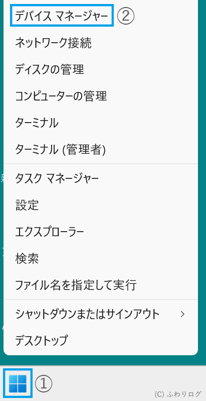 Windowsアイコンを右クリックし、「デバイスマネージャー」をクリック