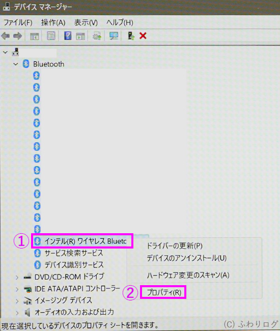 デバイスマネージャーの「Bluetooth」からPC内蔵のBluetoothモジュール名を右クリックし、「プロパティ」を選択