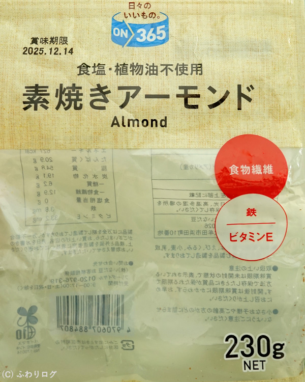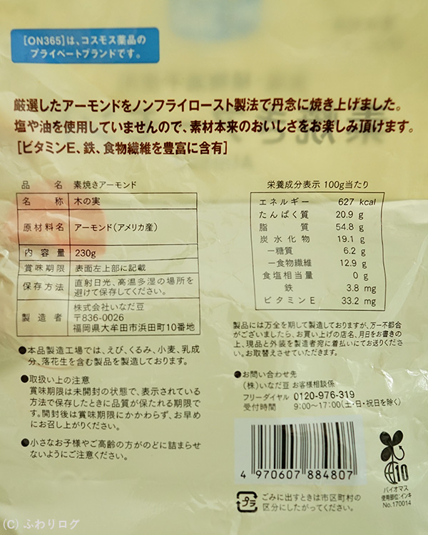 左の [ON365]の素焼きアーモンド(袋表面|裏面) と比較すると、アーモンドの粒が少し大きめです。