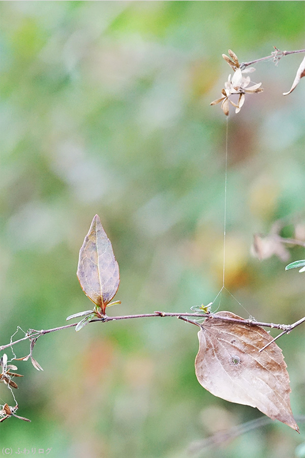 上の枯れた花が蜘蛛の糸で下の葉っぱを支えています。