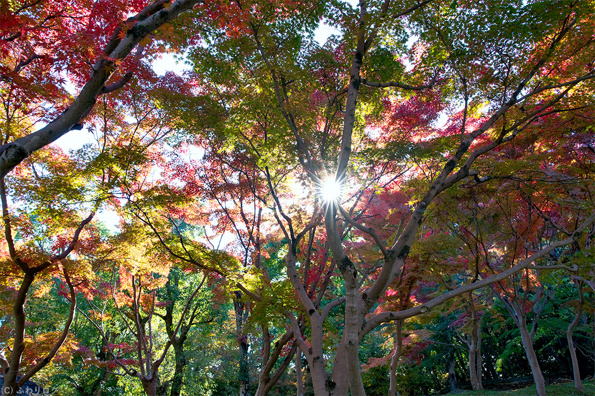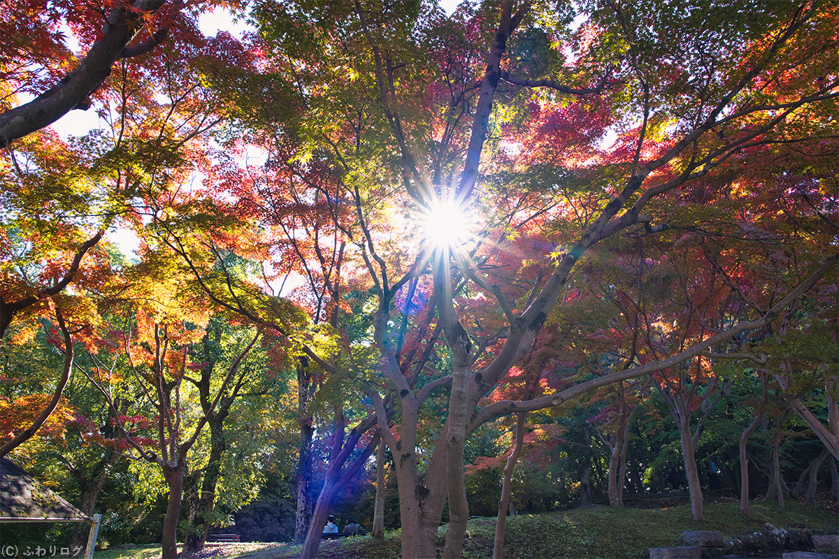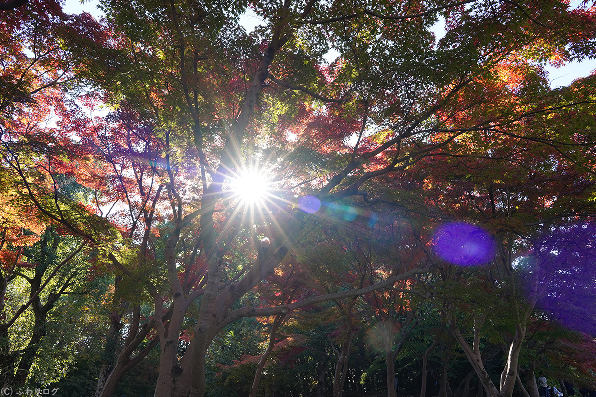 グラデーションの紅葉に太陽がチラ見えしたので、次は木漏れ日も入れて紅葉を撮ってみました♪