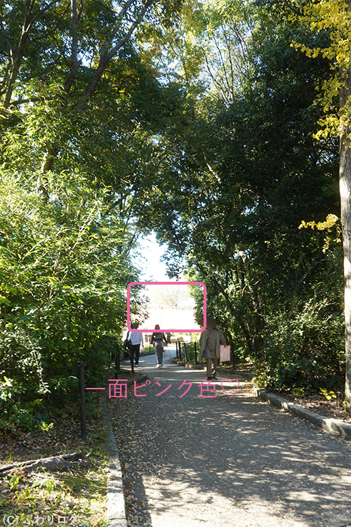 帰り際、看板にひかれてちらり通りから右手を見たら、キラキラ光る一面のピンク色が目に飛び込んで来て、
